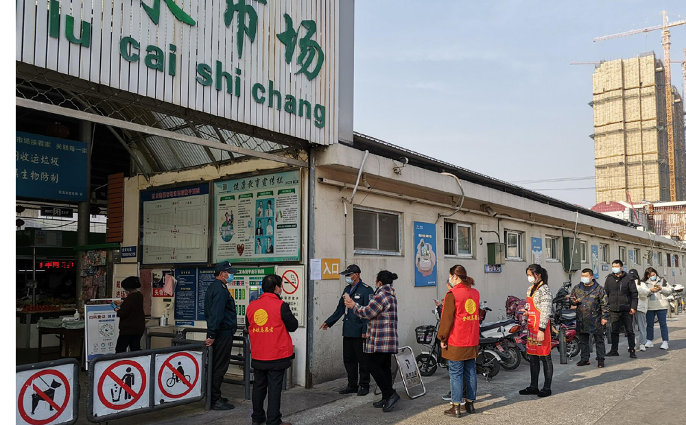 農(nóng)貿(mào)市場是海州區(qū)農(nóng)副產(chǎn)品的重要集散地,在疫情期間,市場人員密集、結(jié)構(gòu)復(fù)雜、進(jìn)出流量大,防控難度極大。為確保市場運(yùn)行有序、疫情防控到位,市場管理人員每日早早到崗,牢牢堅守在防控一線陣地上,利用LED、口頭宣教、張貼公告等多種形式,積極宣傳新型冠狀病毒防護(hù)知識,嚴(yán)格按照疫情防控要求落實測溫、掃碼、戴口罩、消毒等各項措施,有力保障進(jìn)場群眾及商戶人身安全。