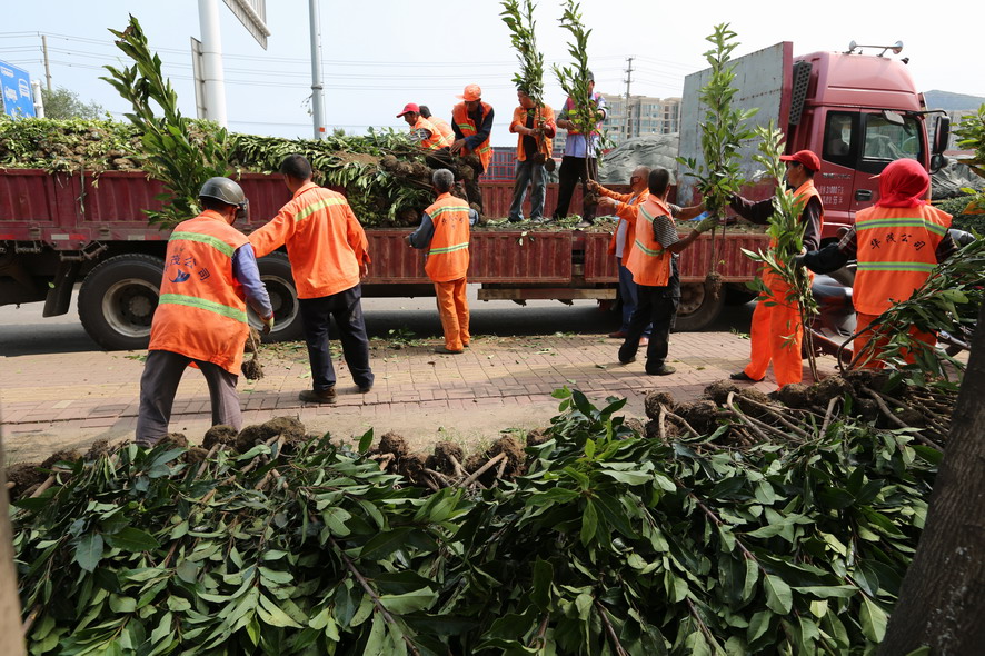 新光路鐵路橋至港城大道段南側(cè)綠化帶,因?yàn)槿藶椴忍?、車輛碾壓導(dǎo)致綠化斑禿損壞嚴(yán)重,為盡快恢復(fù)綠化原貌,改善市容市貌。8月18日,裕升、裕欣養(yǎng)護(hù)公司組織80多名綠化工,從早上6點(diǎn)一直干到下午6點(diǎn),卸苗、運(yùn)苗、挖坑、插苗,烈日酷暑下奮戰(zhàn)一整天,中午在樹陰下吃點(diǎn)盒飯,喝點(diǎn)礦泉水,繼續(xù)工作,橘黃色工作被汗水浸透、被烈日烤干,這樣有好幾個(gè)來回。“今天我們要在這片綠化補(bǔ)植紅葉石楠、金森女貞等模紋小苗1萬余株,紅葉石楠球等灌木110株,有效改善該路段綠化植被,提升城市形象,我們還要在黃海續(xù)道補(bǔ)植草坪近30000平方,在這條1000多米長的路段,有車輛維修點(diǎn)50多家,車輛出入,對(duì)路邊綠化帶傷害非常大,這一路段也是環(huán)衛(wèi)整治長期存在的‘老大難’,這次,在開發(fā)區(qū)行政執(zhí)法部門的配合下,我們要重新種植草坪,對(duì)這一‘老大難’路段植被進(jìn)行恢復(fù),另外德蘭南路、東路補(bǔ)植苗木近80萬元的綠化工程也已開工上土整土,接著要栽苗,根據(jù)開發(fā)區(qū)創(chuàng)衛(wèi)部署要求,上述這些事情必須在8月底完成,所以說時(shí)間相當(dāng)緊,職工們都冒著高溫,加班加點(diǎn)搶進(jìn)度?!惫靖笨偨?jīng)理郁宏峰說。