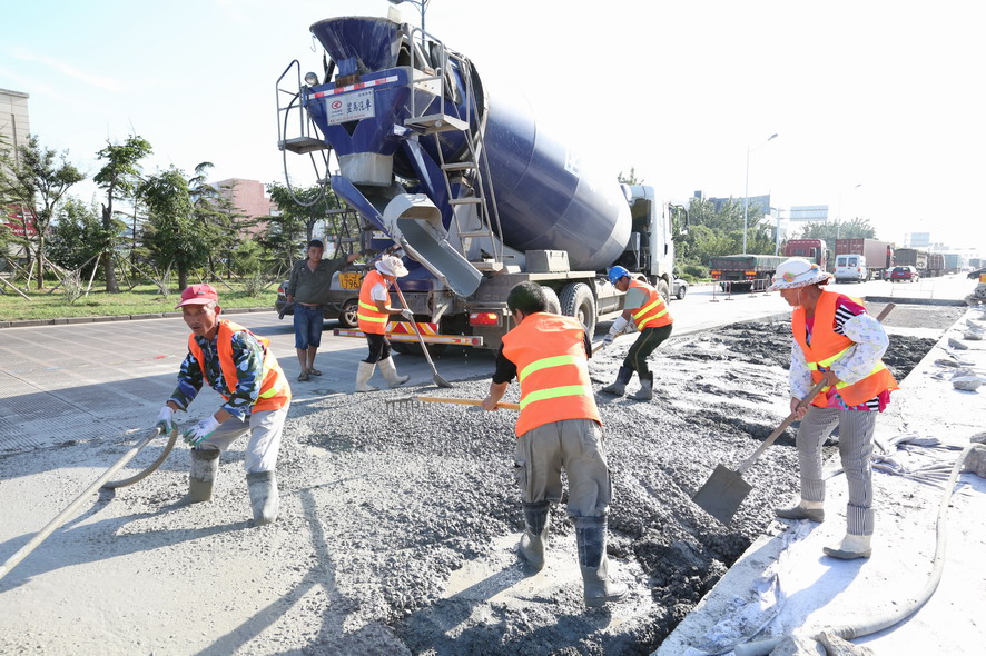 在大港路“新光路至零公里”路段,筆者在水泥路上看到一塊塊被切割成方方正正的凹面,四周都架好防護(hù)欄等安全防護(hù)設(shè)施,在華東城北門偏東不遠(yuǎn)處,一臺(tái)挖掘機(jī)的鏟斗被換上沖擊破碎錘,正在一大塊破損的水泥路面沖擊破碎作業(yè),“嗒嗒嗒”的沖擊聲十分震耳。在與現(xiàn)場作業(yè)的盛達(dá)市政公司市政維修項(xiàng)目部副主任史如勤交流中得知,該路段是附近集團(tuán)箱基站進(jìn)出港口集裝箱車輛的重要通道,每天有好幾百輛集裝箱車輛進(jìn)出,水泥路面不堪重負(fù),損壞比較嚴(yán)重,根據(jù)開發(fā)區(qū)創(chuàng)衛(wèi)工作要求,由他們對(duì)該路段破損處進(jìn)行局面分割維修,整個(gè)路段維修面積達(dá)到5000多平方,為保證道路使用通行,采取半幅維修、邊破碎邊澆灌的方式,保證施工進(jìn)度,現(xiàn)正在維修北側(cè)路面,整個(gè)路面維修計(jì)劃在8月底完成?!耙?yàn)閯?chuàng)衛(wèi),我們下一步還要對(duì)轄區(qū)內(nèi)的破損、歪到的路牙石進(jìn)行維修扶正,242路段瀝青破損路面維護(hù),還要開通四處道口,而現(xiàn)在事多人少,人手比較緊張,我們周六周日都沒有休息,就是想把創(chuàng)衛(wèi)工作任務(wù)一項(xiàng)一項(xiàng)地及時(shí)完成,決不能拖創(chuàng)衛(wèi)工作后腿。”他邊說邊用肩上的毛巾擦著額頭上的汗水。
