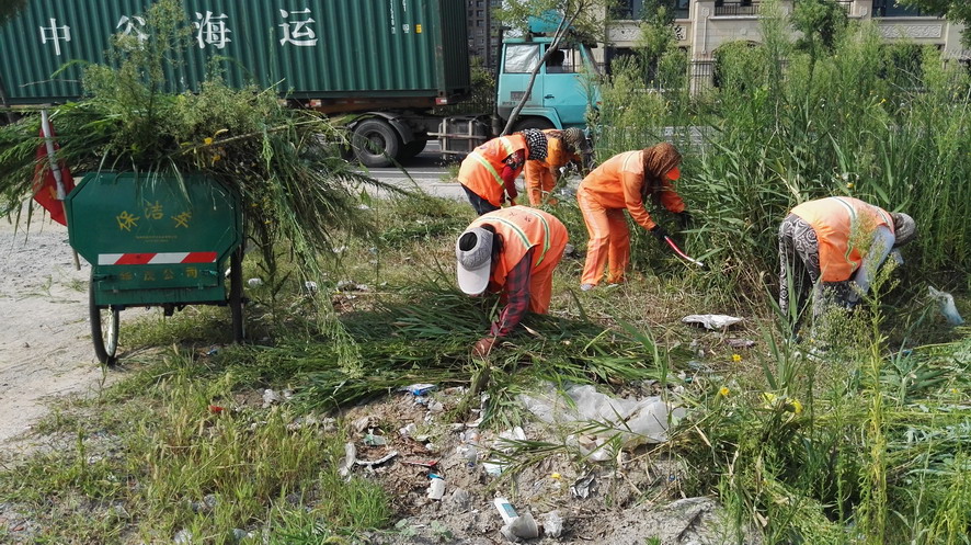 在昌圩湖環(huán)湖路南側(cè)一處公共廁所處,裕升養(yǎng)護(hù)公司20多名環(huán)衛(wèi)保潔工人正在清理公廁周邊的雜草、建筑垃圾,有的在割草、有的在搬磚、有的在推車,一個(gè)個(gè)汗流浹背,忙得不亦樂乎。正在現(xiàn)場忙碌的保潔大隊(duì)長劉保軍對(duì)筆者說:“這一塊段還沒有交給我們養(yǎng)護(hù),一直無人管理,雜草叢生,成為建筑、裝修垃圾的堆放地,根據(jù)開發(fā)區(qū)創(chuàng)衛(wèi)環(huán)境衛(wèi)生無死角要求和華茂公司生產(chǎn)技術(shù)部門指令,我們?cè)IB(yǎng)護(hù)公司承擔(dān)這一區(qū)域環(huán)境衛(wèi)生突擊整治任務(wù),從綠化保潔班組抽調(diào)20多人來搞突擊,大家面對(duì)天氣炎熱、工作量大、清理困難等因素,發(fā)揚(yáng)不怕吃苦、敢打硬仗的華茂精神,奮戰(zhàn)在突擊現(xiàn)場,每個(gè)人都汗流不止,工作服全被汗水浸透,昨天我們已在這里整整干了一天,由于垃圾量大、雜草面積大,我們動(dòng)用了裝載機(jī)等機(jī)械設(shè)備,運(yùn)雜草的三輪車跑近百趟,清理建筑、裝修等垃圾數(shù)十噸。估計(jì)今天下午能夠全部結(jié)束?!?/span>