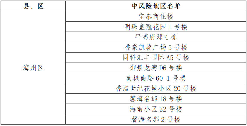 根據(jù)國(guó)務(wù)院聯(lián)防聯(lián)控機(jī)制有關(guān)規(guī)定,經(jīng)市指揮部研究決定,自發(fā)布之日起,對(duì)我市部分區(qū)域疫情風(fēng)險(xiǎn)等級(jí)進(jìn)行調(diào)整:海州區(qū)同科匯豐國(guó)際C10號(hào)樓、紫金公館3號(hào)樓、興業(yè)時(shí)代花園B6號(hào)樓、興業(yè)時(shí)代花園C6號(hào)樓、九龍城市樂園77號(hào)樓、明珠皇冠花園20號(hào)樓、華潤(rùn)公寓、雙龍村澗西隊(duì)65號(hào)、眾興華庭10號(hào)樓、壹品國(guó)際C區(qū)、香溢世紀(jì)花城小區(qū)2號(hào)樓、明珠皇冠花園11號(hào)樓、小學(xué)路11-1號(hào)樓、兆隆城市洋房A號(hào)樓、振興小區(qū)2號(hào)樓、易居公館4號(hào)樓、浦潤(rùn)花園4號(hào)樓由中風(fēng)險(xiǎn)地區(qū)調(diào)整為低風(fēng)險(xiǎn)地區(qū)。其他地區(qū)風(fēng)險(xiǎn)等級(jí)不變。調(diào)整后全市現(xiàn)有11個(gè)中風(fēng)險(xiǎn)地區(qū)。