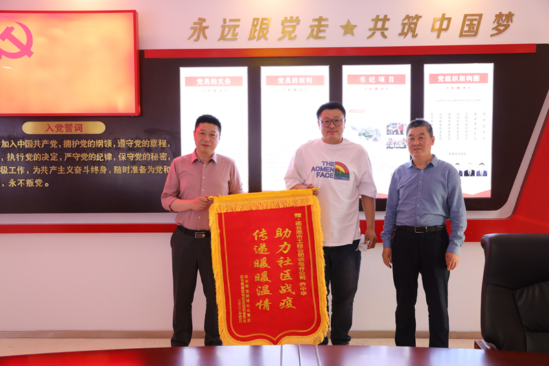 5月5日下午,新東街道新城社區(qū)居委會(huì)工作人員來(lái)到公司,為感謝公司黨員喬中華在該社區(qū)疫情防控期間守護(hù)居民群眾的健康安全,為打贏疫情防控阻擊戰(zhàn)發(fā)揮的積極作用,將寫(xiě)有“助力社區(qū)戰(zhàn)疫 傳遞暖暖溫情”的錦旗送到公司黨委書(shū)記、總經(jīng)理宋晟曄手中。