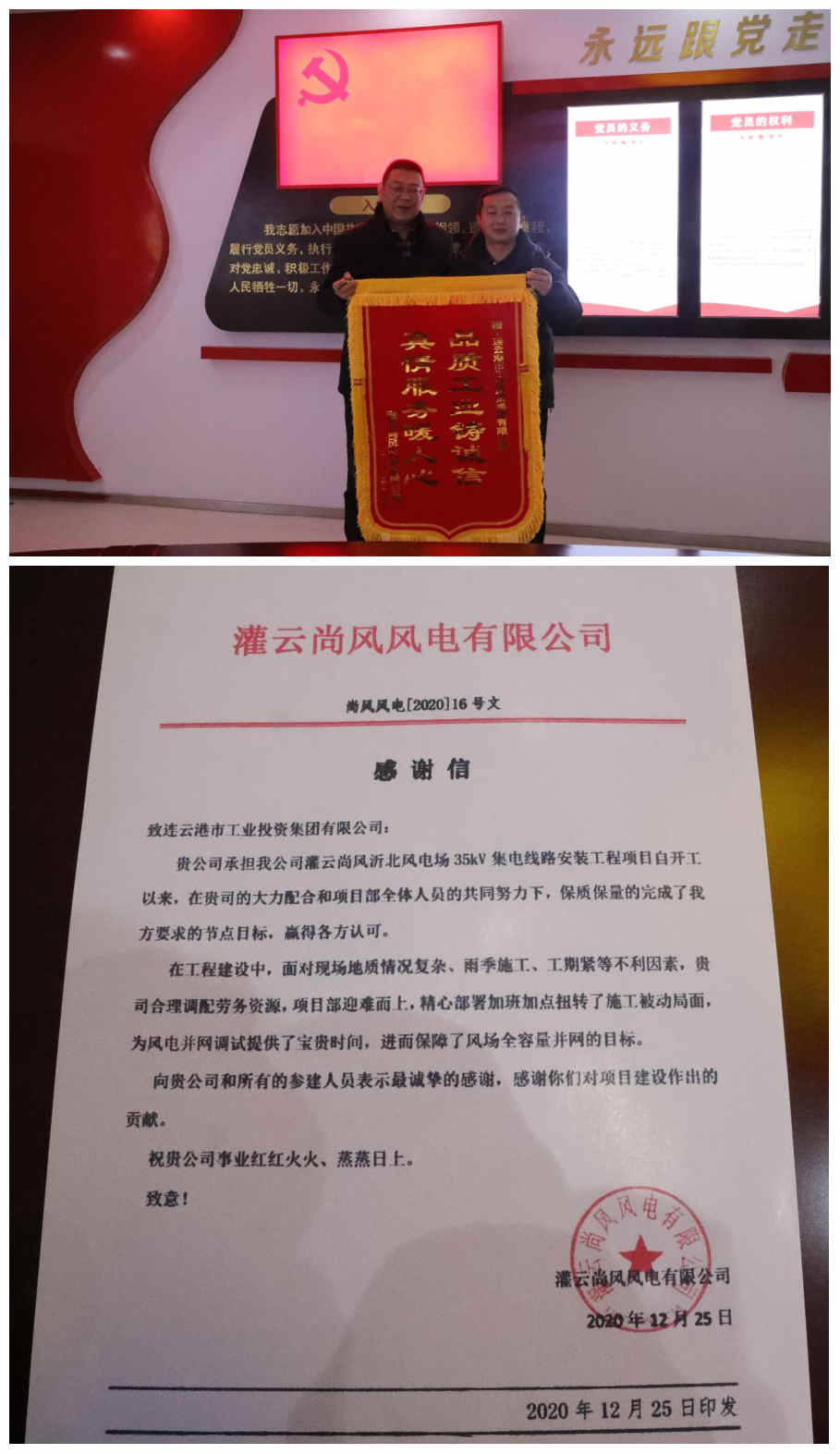 1月28日上午,灌云尚風(fēng)風(fēng)電有限公司副總經(jīng)理王現(xiàn)奇一行來到公司,授予我司一面錦旗和一封《感謝信》,以感謝半年來我司在灌云尚風(fēng)沂北風(fēng)電場35kV集電線路安裝工程項目中做出的貢獻(xiàn)。
