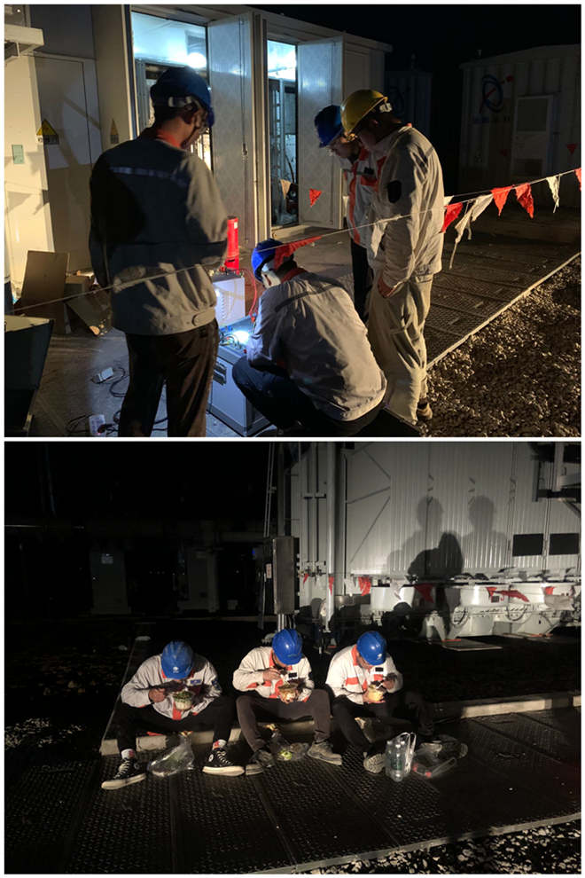 據(jù)悉,電纜耐壓試驗一相必須做滿一小時,做完兩根電纜耐壓試驗最少需要6小時。這意味著今晚將是個不眠之夜,面對這種情況,青年突擊隊隊員王程龍主動請纓,帶著王磊、祁明智、董毓帶上準備好的試驗設備二話不說奔去升壓站。升壓站附近環(huán)境惡劣,沒有路燈,只能用手電筒照明,且蚊蟲較多。在勘查過場地、熟悉工作任務需求、了解了有關注意事項后,他們熟練快速的連接調試好設備,開始做起了試驗。為了防止試驗過程中意外出現(xiàn),幾人一直盯著設備,絲毫不敢松懈,一直鏖戰(zhàn)至凌晨5點,才順利完成試驗。(盧正遷、董毓)
