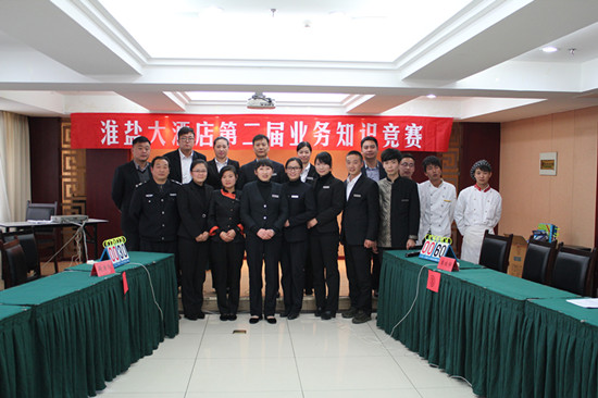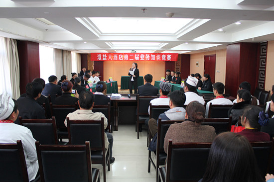 為了進(jìn)一步提高酒店全體員工安全生產(chǎn)意識(shí)以及酒店專業(yè)業(yè)務(wù)水平,淮鹽大酒店于11月19日舉行第二屆“酒店綜合知識(shí)競(jìng)賽”,酒店總經(jīng)理伏運(yùn)余、副總經(jīng)理?xiàng)罘?、質(zhì)檢經(jīng)理周洪近、餐飲經(jīng)理郭天麗擔(dān)任裁判,現(xiàn)場(chǎng)氣氛非常活躍,競(jìng)賽取得圓滿成功。