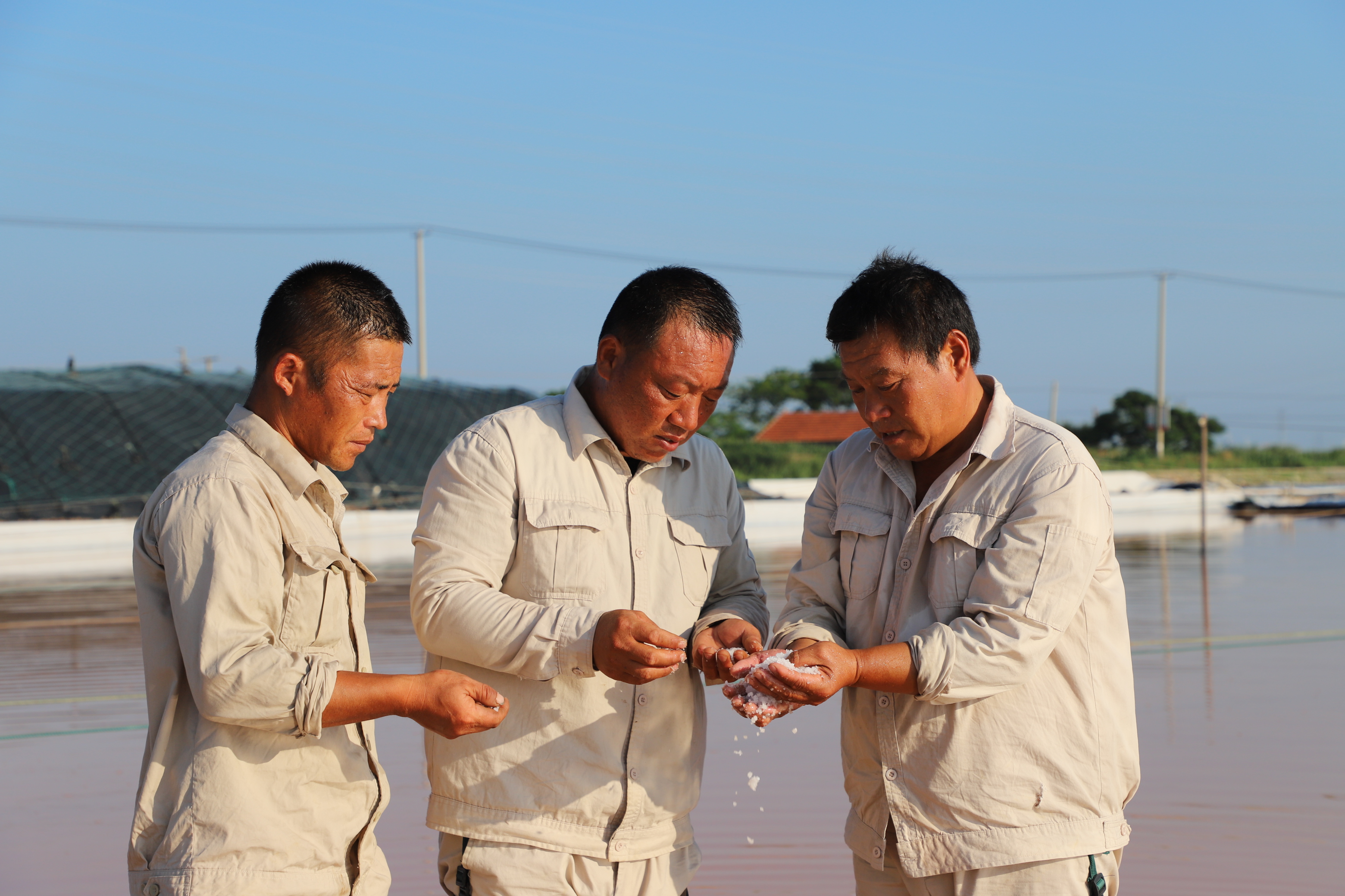 “氣溫越高,鹽的蒸發(fā)量就越高,公司效益就好,按今年的產(chǎn)鹽趨勢(shì),超額完成公司指標(biāo)任務(wù)應(yīng)該不成問題,我們工人心里也高興呀!”勞模祝星星擦著臉上的汗珠自豪的說道。“晴天一身汗,雨天一身泥”是制鹽人的家常便飯,為確保汛期安全生產(chǎn),避開高溫時(shí)段作業(yè),凌晨五點(diǎn)鐘,工人們已忙著鹵水除硫、維護(hù)收拉塑布收房系統(tǒng)、修補(bǔ)塑布……。鹽工身上的汗水與鹵水交織在一起,浸濕了工作服,透過驕陽他們黝黑的臉龐顯得越發(fā)的锃亮。