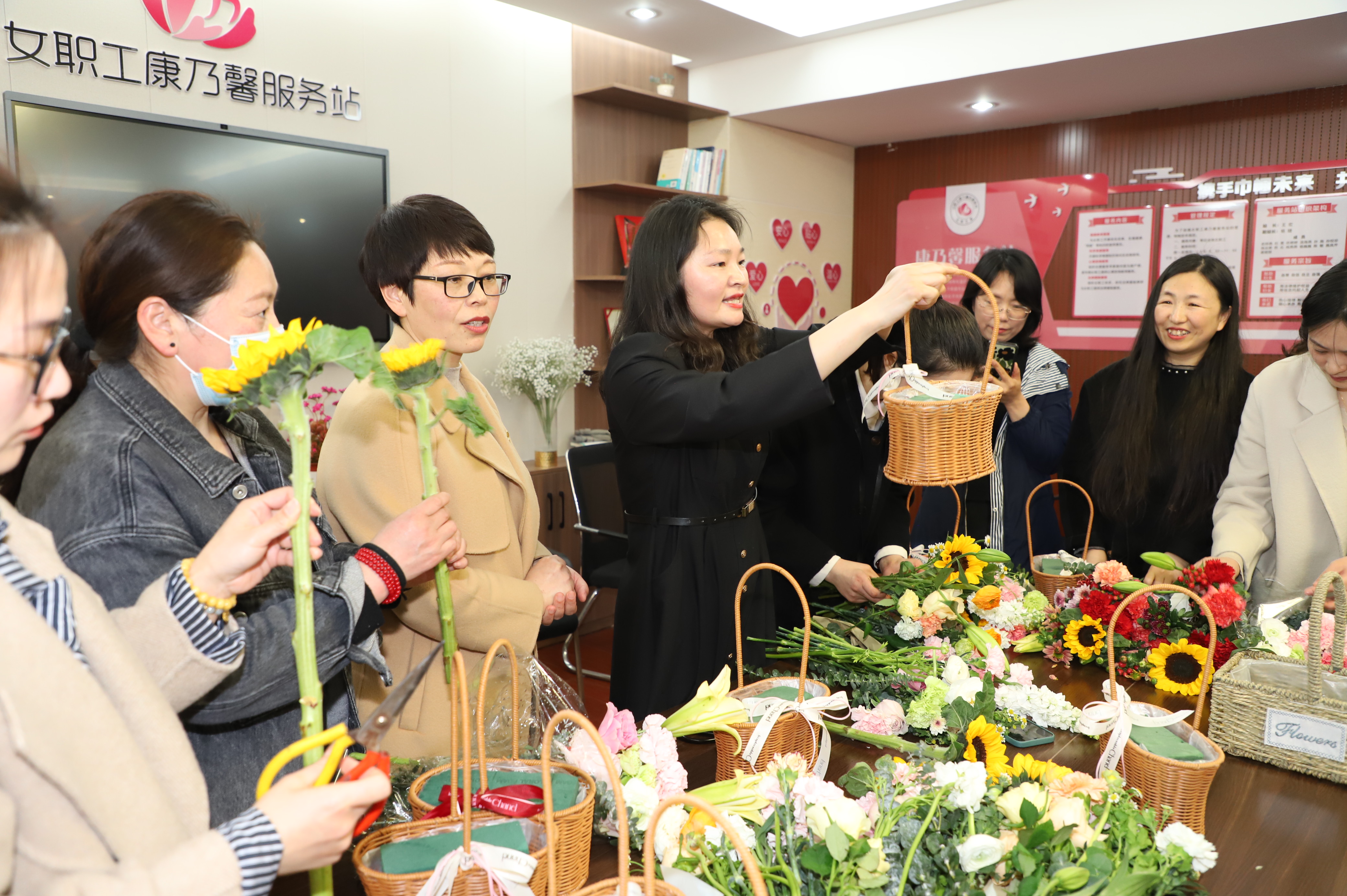 隨后開(kāi)展的藝術(shù)插花活動(dòng),更是將節(jié)日慶祝氣氛推向了高潮。活動(dòng)現(xiàn)場(chǎng),邀請(qǐng)專業(yè)插花老師進(jìn)行現(xiàn)場(chǎng)指導(dǎo),插花老師用通俗易懂的語(yǔ)言講授插花基本技巧,從顏色的搭配、花枝長(zhǎng)短的修剪以及造型等方面進(jìn)行細(xì)致講解,大家也紛紛行動(dòng)起來(lái),構(gòu)思設(shè)計(jì),在老師的指導(dǎo)下將各種花材修剪和整枝,忙的不亦樂(lè)乎。一盆盆姿態(tài)各異的花在女神們靈巧的雙手下陸續(xù)誕生,形成了一幅幅獨(dú)具匠心又飽含深意的插花作品。感受節(jié)日美的“她”,看著自己親手創(chuàng)作的插花作品,參與活動(dòng)的30多名女職工感到滿滿的成就感和幸福感,現(xiàn)場(chǎng)一片其樂(lè)融融。