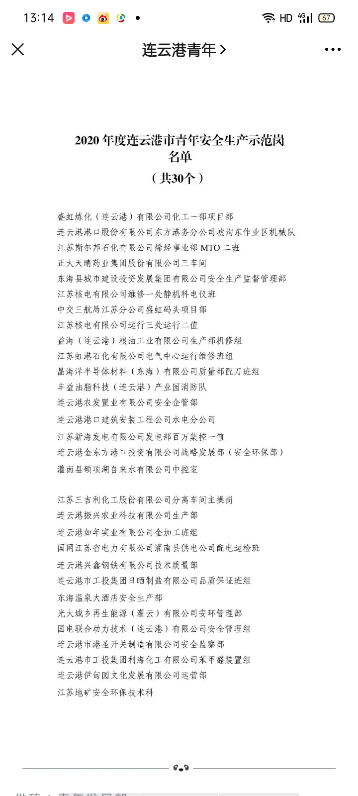 11月12日,共青團(tuán)連云港市委員會(huì)公布2020年度連云港市青年安全生產(chǎn)示范崗名單,連云港市工投集團(tuán)日曬制鹽公司品質(zhì)保證班組被評(píng)為2020年度連云港市青年安全生產(chǎn)示范崗。
