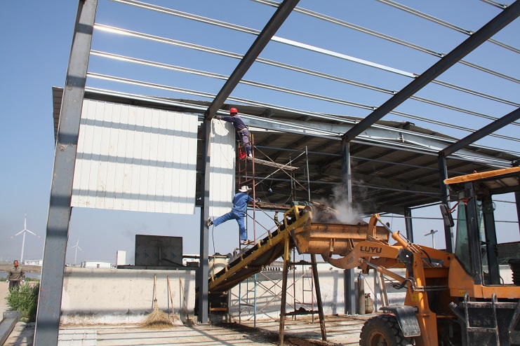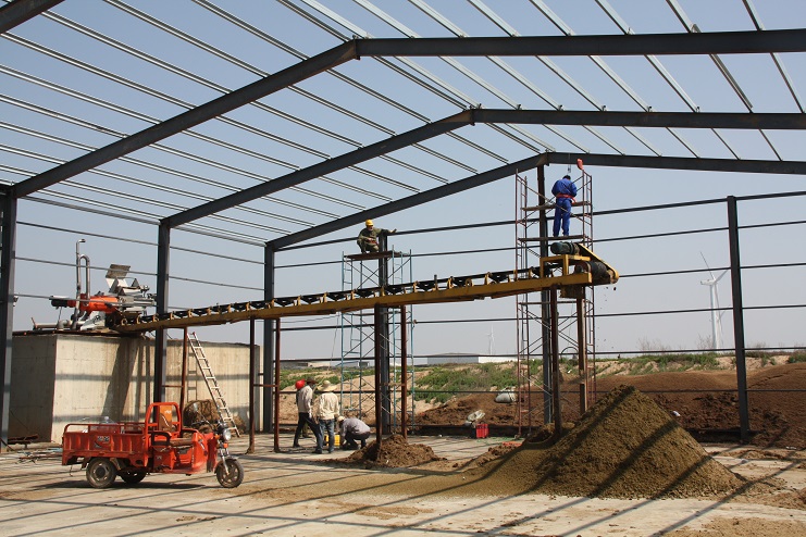 5月18日,位于北北歐農(nóng)莊生豬養(yǎng)殖廠旁邊的綠淮肥業(yè)公司有機肥生產(chǎn)基地,一個鋼結(jié)構(gòu)廠房即將完工,只見機聲轟鳴、焊花飛濺,機電服務(wù)公司的工人在勞模王緒華帶領(lǐng)下正在焊接鋼結(jié)構(gòu)件,而正在建設(shè)施工中的廠房內(nèi),兩條有機肥生產(chǎn)線運轉(zhuǎn)不停,沒有因廠房建設(shè)而停產(chǎn),廠房旁邊的一臺挖掘機正在整平場地,一邊建設(shè),不邊生產(chǎn),一派紅火景象。