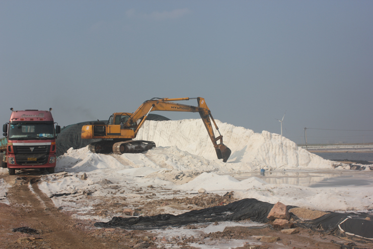 隨后我們又來到了新河制鹽分公司十四班的裝鹽現(xiàn)場。一位工人操作著挖掘機,往卡車上裝鹽銷售,如今裝鹽實現(xiàn)了機械化,工人的勞動負荷也減輕了許多。在埒南制鹽分公司的五班,我們看到七八個工人正在灘頭更換土工布,他們一字排開,先將土工布鋪開,然后分工合作,有的人負責把布理齊鋪平,有的則把磚頭鋪放在布上用來固化。