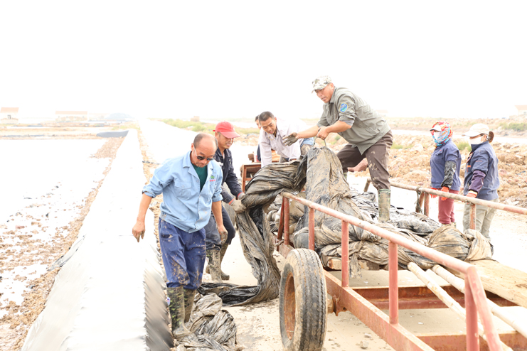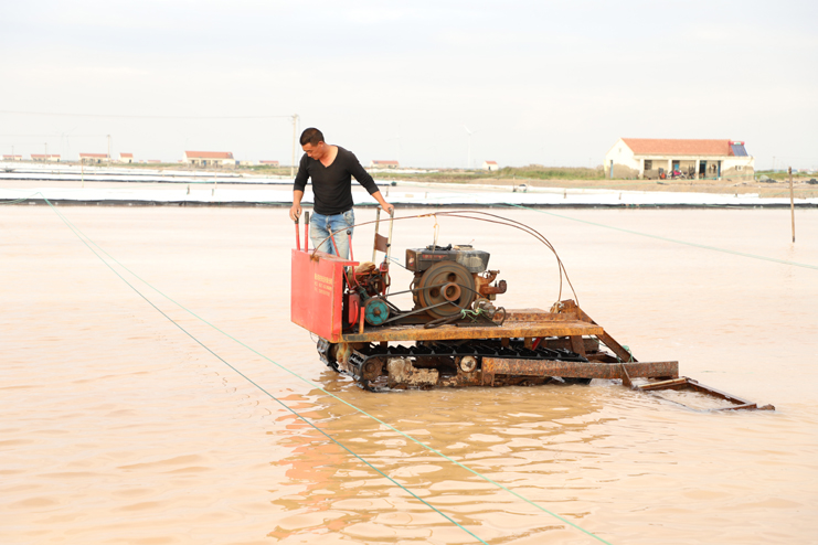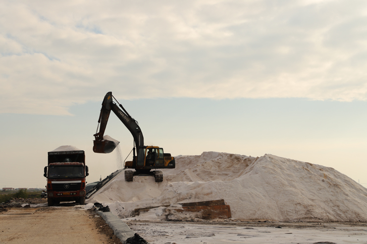 6日下午,在新河制鹽分公司的十二班,扒鹽機(jī)組正在扒鹽,在不遠(yuǎn)處鹽池內(nèi),集鹽機(jī)械正在鹽池內(nèi)緩緩移動(dòng)集鹽,鹽泵運(yùn)轉(zhuǎn)不停,輸鹽上廩,鹽廩上兩名大廩工正在不停筑廩。鹽池內(nèi),有的員工對(duì)破碴作業(yè)機(jī)械進(jìn)行修理,有的員工在整平扒過(guò)鹽的格塊,有的員工在活碴。筆者從該班班長(zhǎng)徐正好處了解到,該公司5號(hào)就開機(jī)扒鹽了,下半年以來(lái),十二班已經(jīng)扒鹽7000余噸。在新河制鹽分公司的十一班,班長(zhǎng)葛高劍正帶領(lǐng)員工裝運(yùn)大廩布,做好扒鹽的準(zhǔn)備工作;在埒南制鹽分公司的九班,機(jī)聲隆隆,一名員正開著活碴機(jī)械在鹽池內(nèi)作業(yè),不遠(yuǎn)處有幾名員工正用土工布叉格埝,對(duì)灘場(chǎng)進(jìn)行維修亮化;八班有一臺(tái)挖掘機(jī)正在鹽廩旁給裝鹽車輛上鹽……,日曬制鹽公司鹽灘上到處都活躍著職工們忙碌的身影。