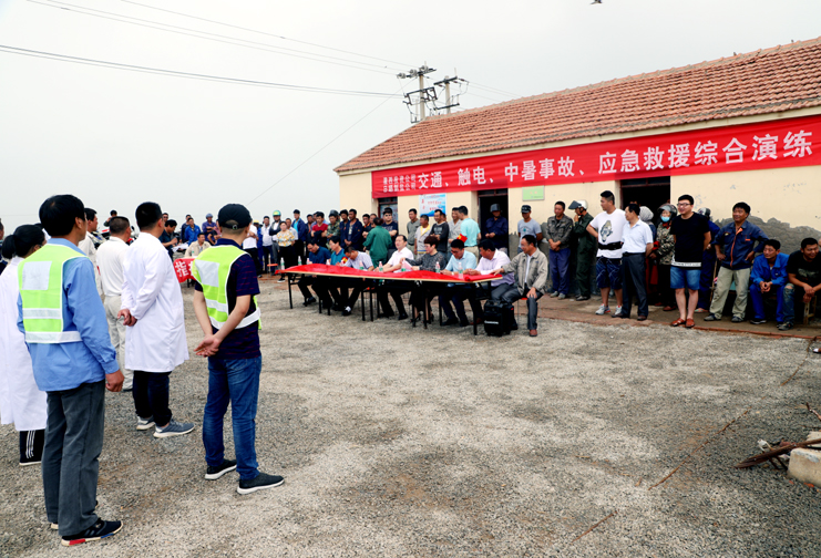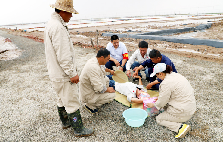 此次演練過程中,安全監(jiān)管部李長軍主持了這次演練活動,埒南制鹽分公司職工及管理人員參與其中,演練模擬現(xiàn)場有三個:1、職工在灘頭塑池堰上突然中暑(重度)。2、職工在廩基小鹽化鹵調(diào)鹵中接觸老化線路接頭時不慎觸電(傷害較重)。3、職工在上班途中三輛電瓶車相撞(跌傷較重)。在救援過程中,大家各司其職,齊心協(xié)力,配合默契,有條不紊成功完成了此次演練活動。通過這次應(yīng)急演練,進(jìn)一步提高了公司員工應(yīng)對緊急事件的自我保護(hù)和防衛(wèi)能力,保證員工在發(fā)生突發(fā)事件時,能熟練應(yīng)對、有序救援,最大限度地減少事故帶來的損害,切實(shí)保護(hù)員工的安全。