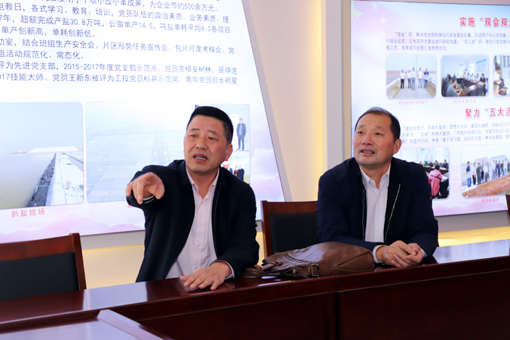 檢查組一行先后到新河制鹽分公司、老機關(guān)新建黨建室進行實地檢查驗收,在新河制鹽分公司黨建活動室,江舜軍部長一行詳細(xì)聽取了該黨支部書記李加新對黨建工作的匯報,隨后,在老機關(guān)綜合黨員活動中心,檢查組一行利用活動室電子顯示屏觀看了集團司歌視頻。