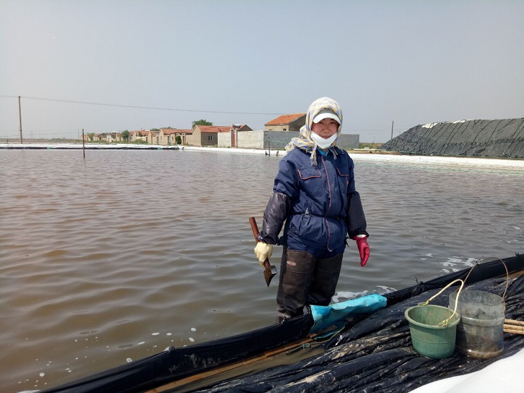 實業(yè)公司制鹽分公司廣大員積極推進海鹽基地建設,最近利用有利天時、高蒸發(fā)量搶制鹵水,起早貪黑忙著走水制鹵,整理塑灘。二班女工皮晶晶工作勤懇認真,正忙著在塑池內(nèi)裝塑布,釘壓條,她是海鹽基地上一朵美麗的“鹽花”。(史祥燕)