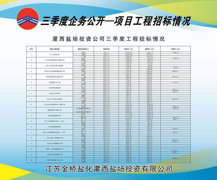 三季度灌西共開工建設(shè)20個工程項目,分4次由投資公司招標領(lǐng)導(dǎo)小組采用公開邀標形式進行了招標。