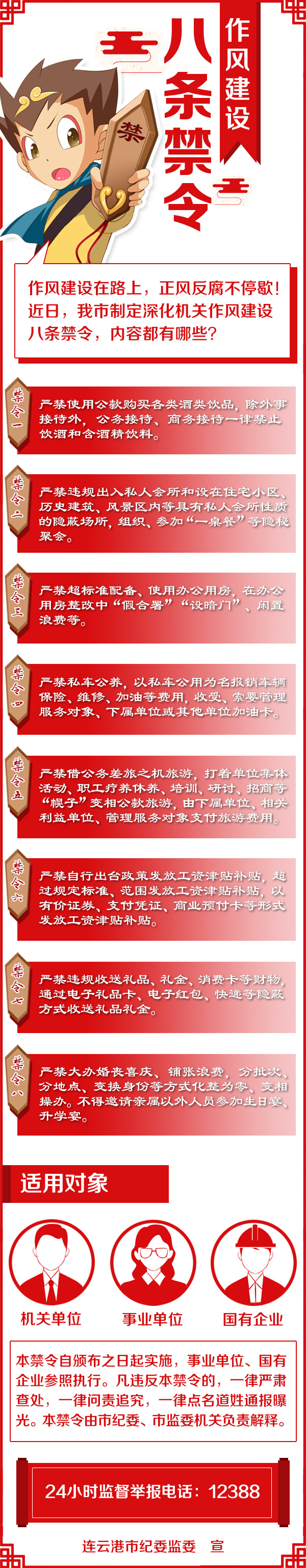 本禁令自頒布之日起實施,事業(yè)單位、國有企業(yè)參照執(zhí)行。凡違反本禁令的,一律嚴肅查處,一律問責追究,一律點名道姓通報曝光。本禁令由市紀委、市監(jiān)委機關負責解釋。24小時監(jiān)督舉報電話:12388。