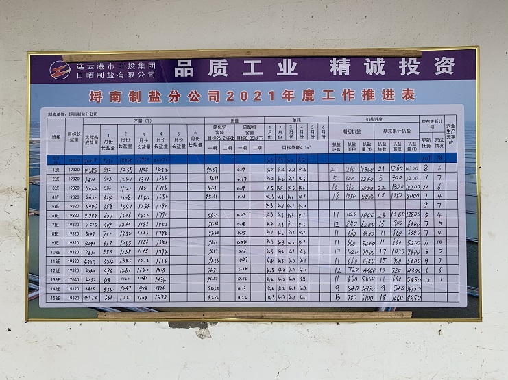 張貼二季度工作推進表,清晰的反映出目前的原鹽產(chǎn)量、質(zhì)量、單耗、以及春季扒鹽情況。分公司經(jīng)理程龍要求各個片區(qū)負(fù)責(zé)人按照表上反映的數(shù)據(jù),查漏補缺,強化生產(chǎn)工作。在提高單產(chǎn)、降低單耗上下功夫,強化“三雨操作”,加強結(jié)晶管理,嚴(yán)格除硫生產(chǎn)工藝,充分利用粉鹽化鹵,下馬格、副廩基等有效面積窮制鹵水,最大限度地降低鹵耗,提高單產(chǎn),加快扒鹽進度、強化扒鹽產(chǎn)量、保證安全工作。