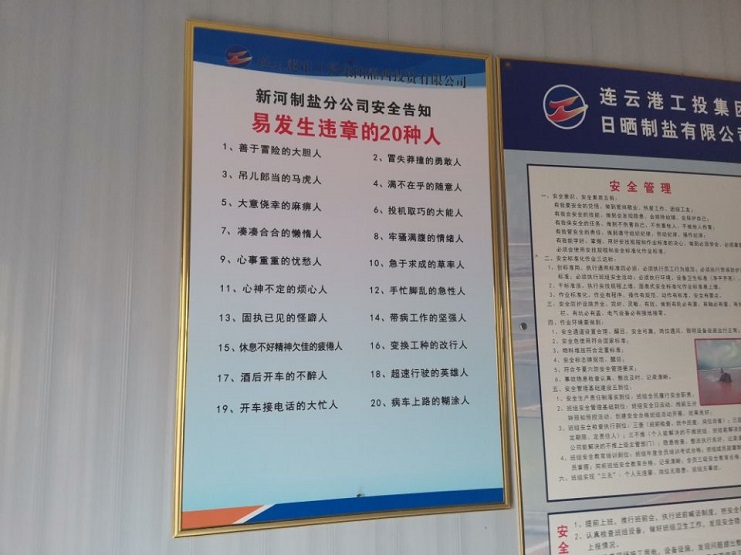 4月25新河制鹽分公司對16個產(chǎn)鹽班組安全活動室加裝安全告知牌,這是該公司防范人為因素造成安全事故,確保安全生產(chǎn)形勢穩(wěn)定采取的措施之一。