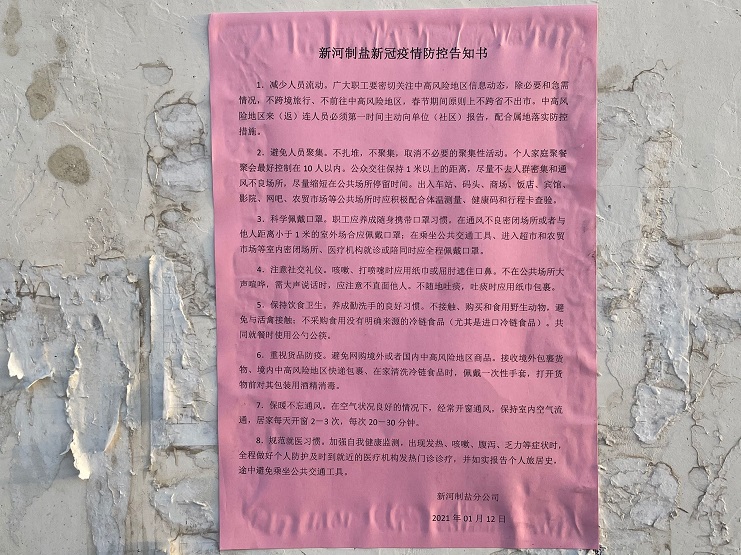 春節(jié)臨近,人員流動(dòng)增加,根據(jù)灌西投資公司疫情防控工作的需要,結(jié)合冬春季疫情形勢,為切實(shí)加強(qiáng)生產(chǎn)一線疫情防控工作 ,進(jìn)一步防范疫情輸入,提高職工自我防護(hù)意識(shí),新河制鹽分公司1月12日在公司醒目位置張貼《疫情防控告知書》,并對各個(gè)班組發(fā)放《疫情防控告知書》,每位員工簽字并存檔。