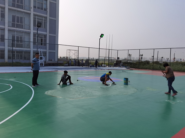灌西籃球場總面積約510平米,附屬球場地面600平米,外圍護(hù)欄高3米。項(xiàng)目圍繞關(guān)鍵節(jié)點(diǎn)及重難點(diǎn),強(qiáng)化施工組織,統(tǒng)籌施工進(jìn)展?;@球場地面露天暴曬,溫度極高,仿佛蒸籠一般。施工人員在進(jìn)行鑿地、涂漆時,僅幾分鐘的功夫,衣服從里到外被汗水浸濕,隨時有中暑的可能性,項(xiàng)目組把責(zé)任明確到個人,開展班前安全教育活動,保證施工安全。施工單位南翼工程公司負(fù)責(zé)人錢明偉克服人員緊缺,工期緊迫等問題,頂著高溫,始終奮戰(zhàn)在工程項(xiàng)目第一線。