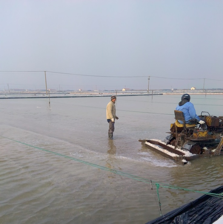 埒南制鹽分公司抓緊做好池鹽破碴工作,為即將開始的春季扒鹽作好準備,利用5臺唐30對去年下半年未參加扒鹽的格塊進行機械破碴,目前已經破碴70%以上。圖為職工利用唐30在池內破碴。(埒宣)
