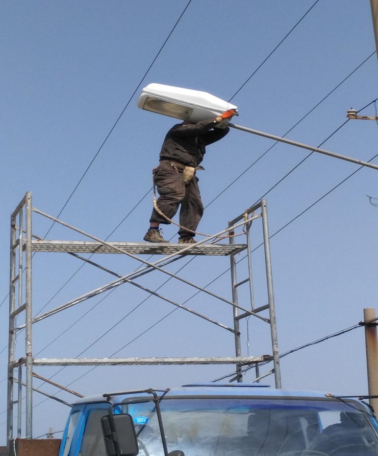 為保證日曬鹽公司職工夜間上班安全,機(jī)電服務(wù)公司接到任務(wù)后,及時組織技術(shù)人員對道路路燈進(jìn)行檢查,確定修理方案, 該公司職工能放棄休息日,進(jìn)行搶修。共更換引線10盞,換燈泡20只。(圖為5月7上午開始修理現(xiàn)場)