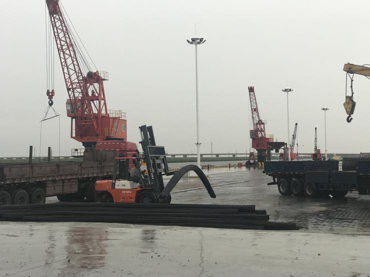 “戰(zhàn)高溫,迎酷暑”,宵洋碼頭從早上開始就忙得如火如荼。裝載管樁的貨船進(jìn)入碼頭,工人們就開始操作著塔吊,穩(wěn)穩(wěn)當(dāng)當(dāng)?shù)膶⒐軜?ldquo;放”入貨車。貨車裝載的盤螺,鋼筋也紛紛到碼頭場(chǎng)地上裝卸。一切工作都井然有序的進(jìn)行著。