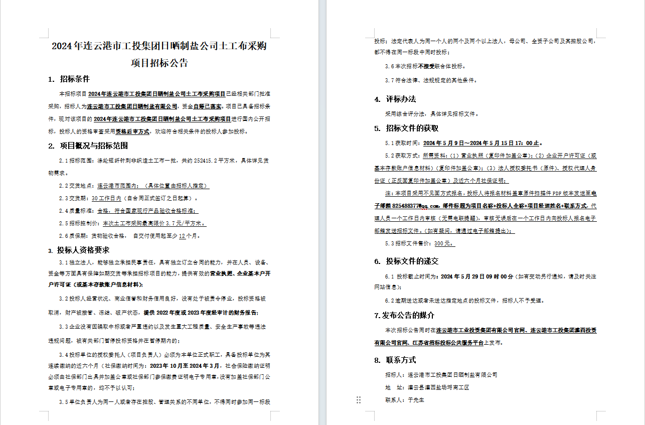 2024年連云港市工投集團(tuán)日曬制鹽公司土工布采購(gòu)項(xiàng)目招標(biāo)公告
