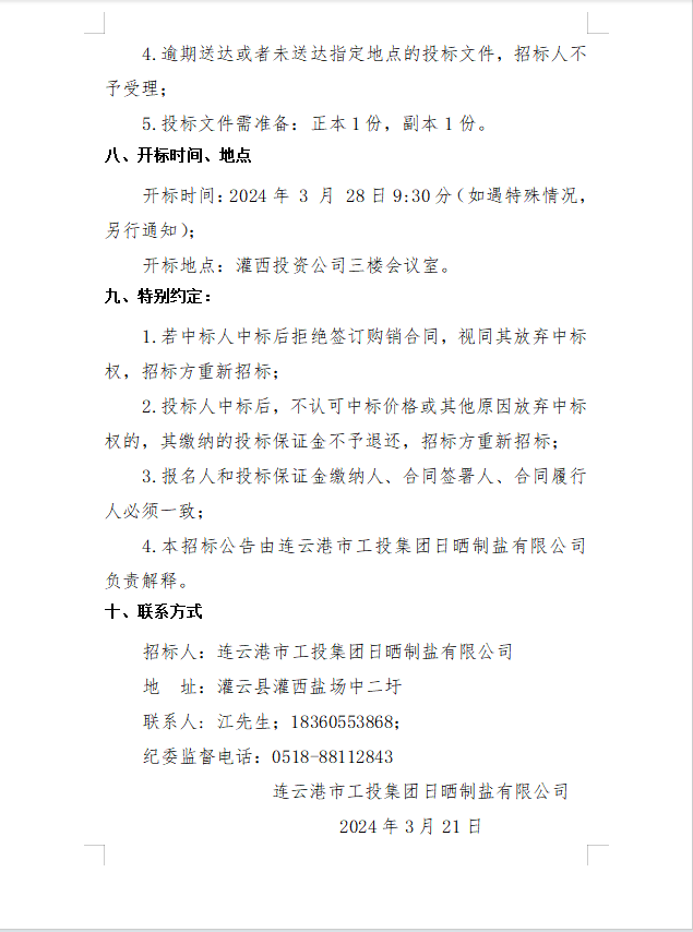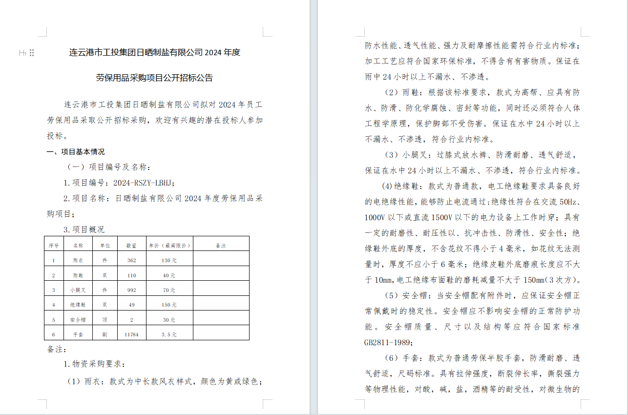 連云港市工投集團日曬制鹽有限公司2024年度勞保用品采購項目公開招標(biāo)公告