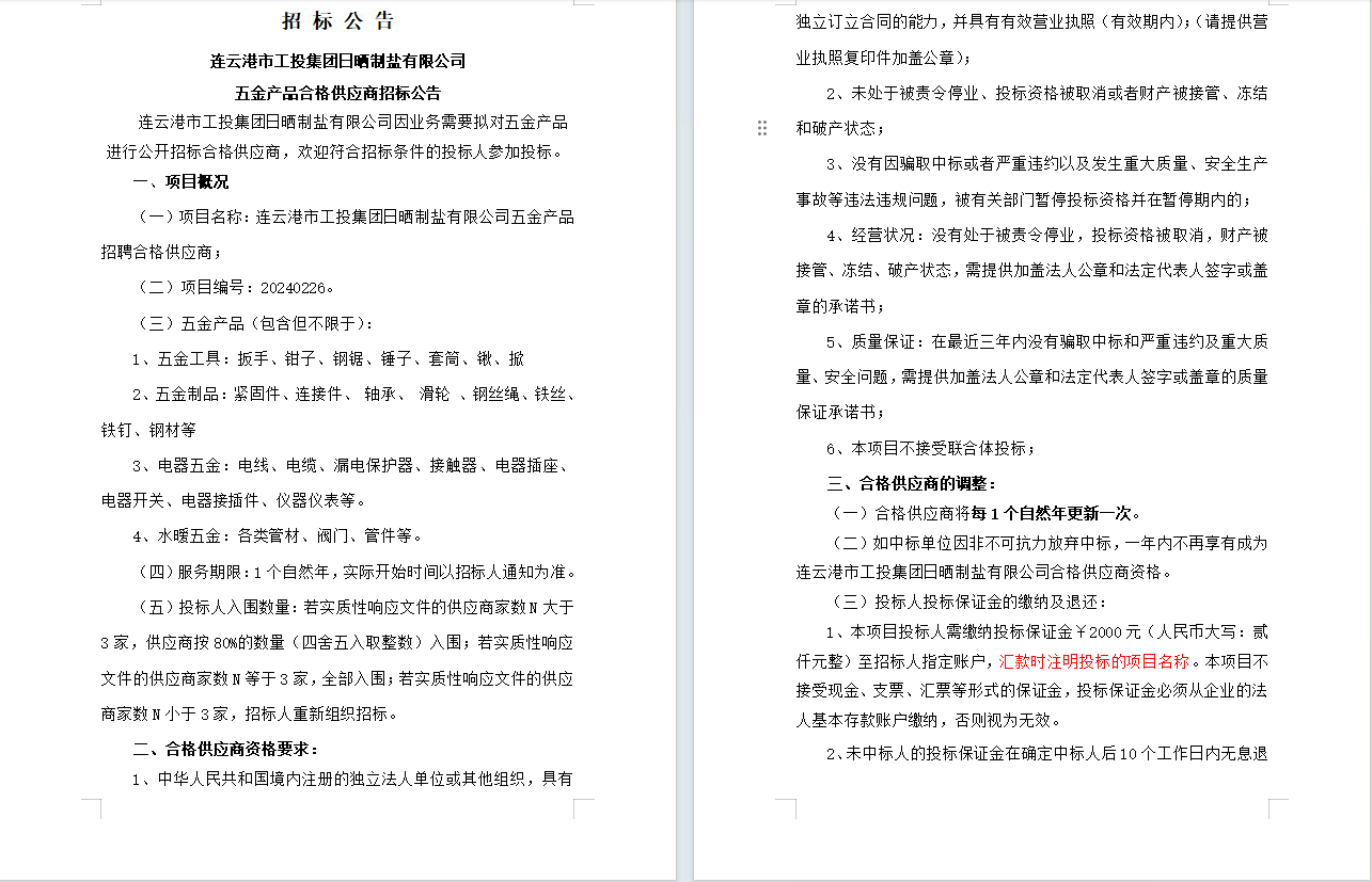 連云港市工投集團日曬制鹽有限公司五金產(chǎn)品合格供應商招標公告