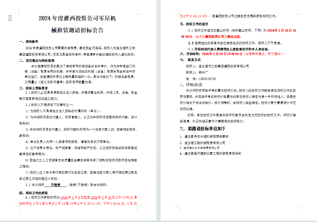 2024年度灌西投資公司零星機(jī) 械租賃邀請招標(biāo)公告