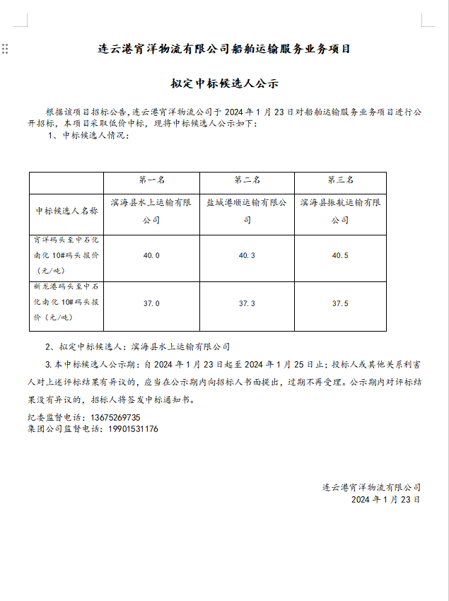 連云港宵洋物流有限公司船舶運輸服務業(yè)務項目擬定中標候選人公示