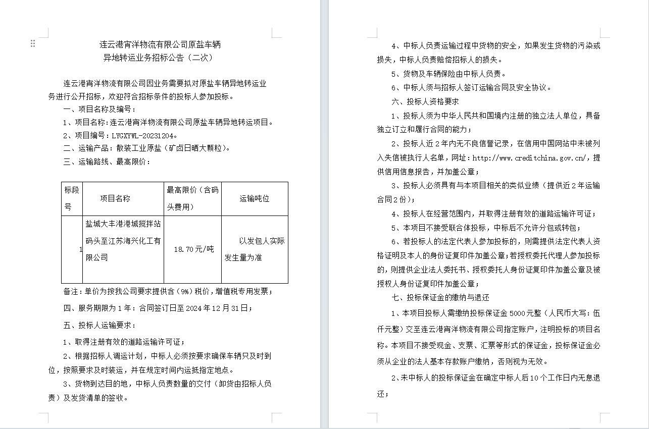 連云港宵洋物流有限公司原鹽車輛 異地轉(zhuǎn)運業(yè)務(wù)招標(biāo)公告(二次)