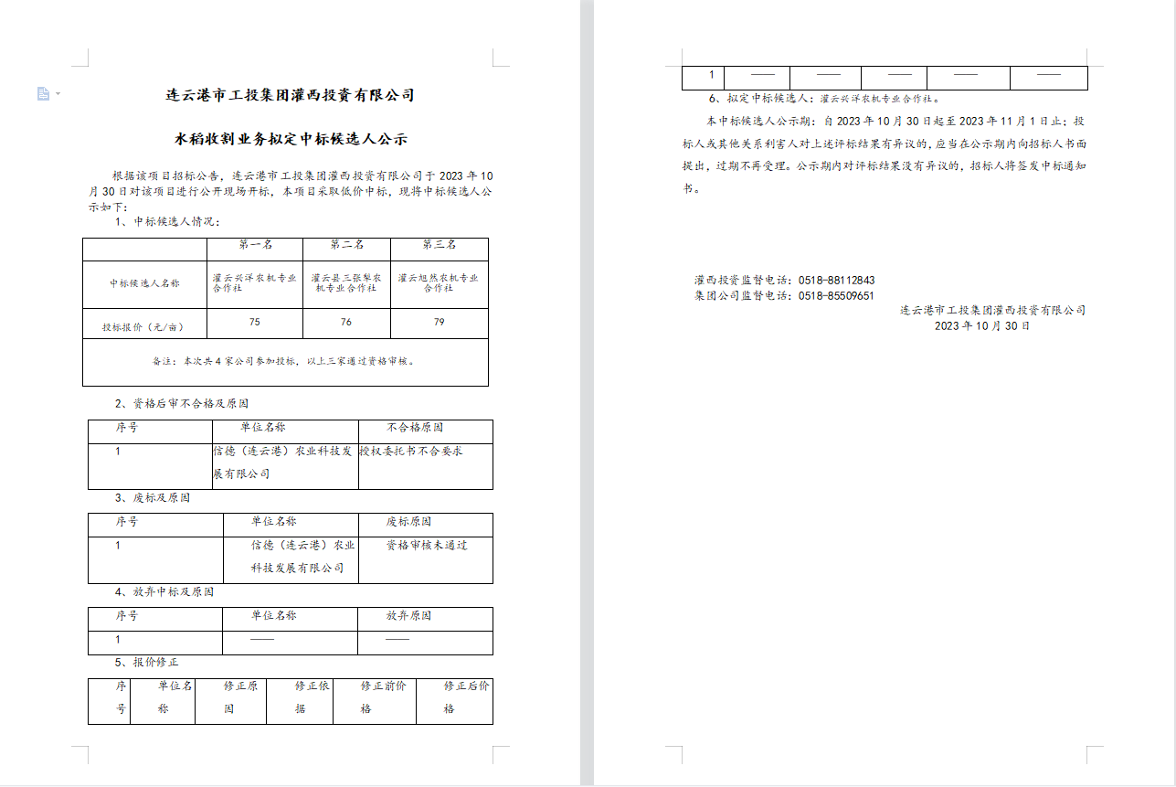 連云港市工投集團(tuán)灌西投資有限公司水稻收割業(yè)務(wù)擬定中標(biāo)候選人公示