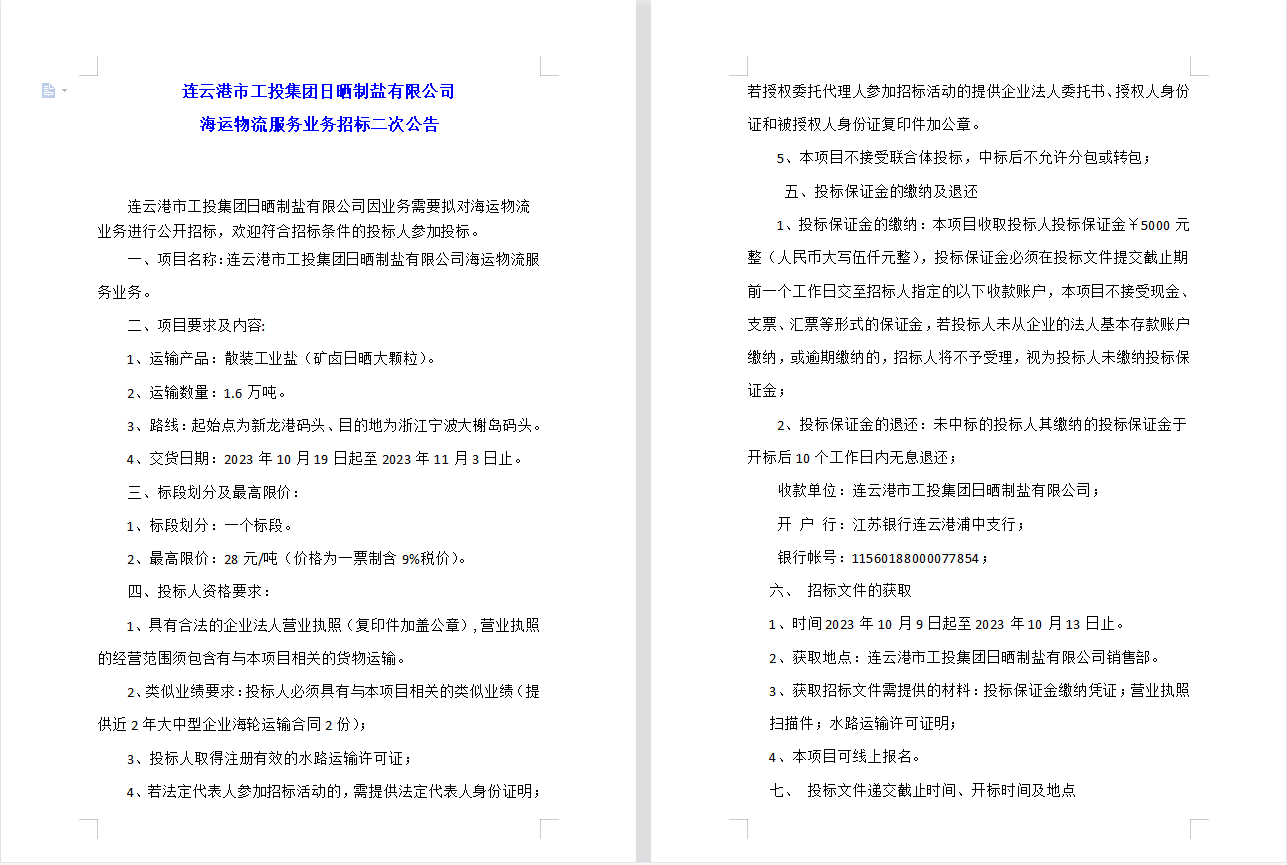 連云港市工投集團(tuán)日曬制鹽有限公司 海運(yùn)物流服務(wù)業(yè)務(wù)招標(biāo)二次公告