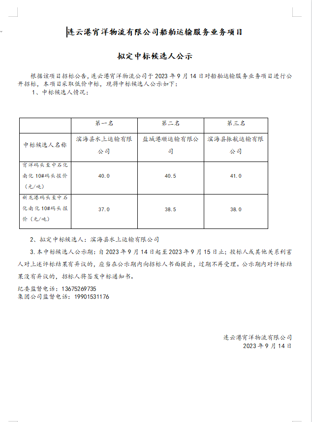 連云港宵洋物流有限公司船舶運(yùn)輸服務(wù)業(yè)務(wù)項(xiàng)目擬定中標(biāo)候選人公示
