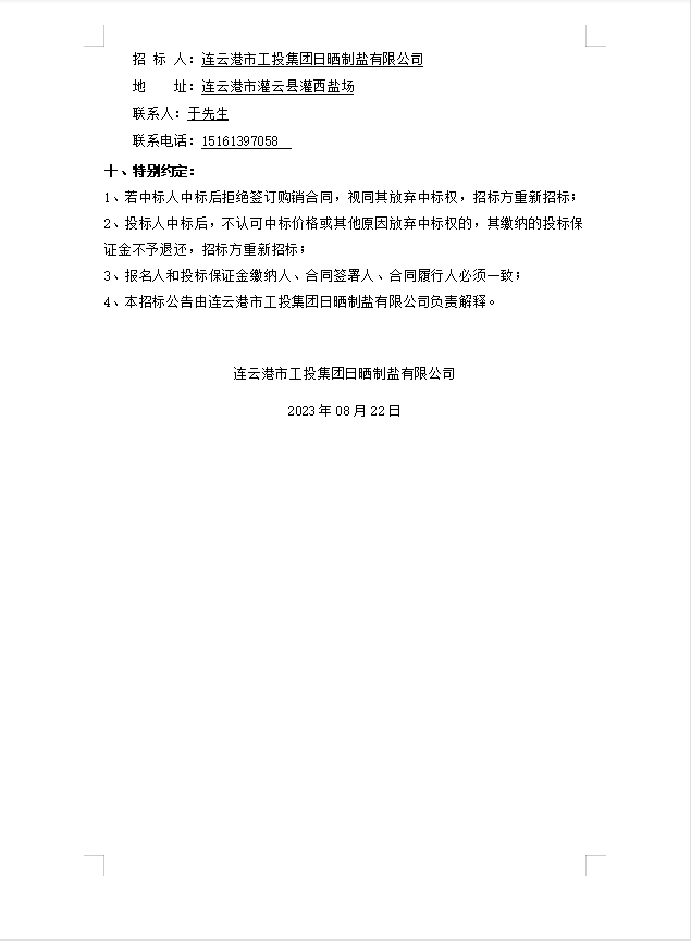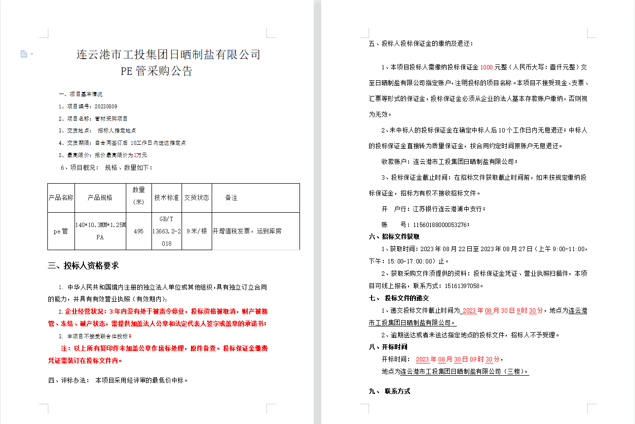 連云港市工投集團日曬制鹽有限公司PE管采購公告