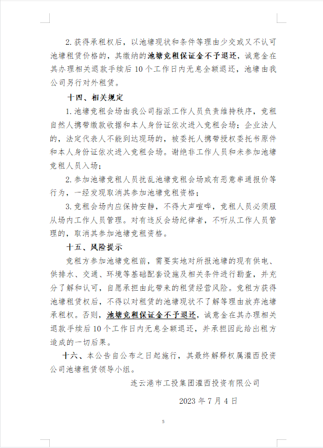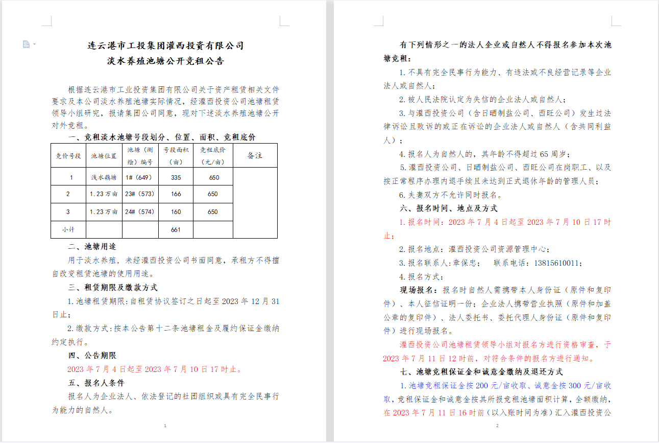 連云港市工投集團(tuán)灌西投資有限公司淡水養(yǎng)殖池塘公開(kāi)競(jìng)租公告