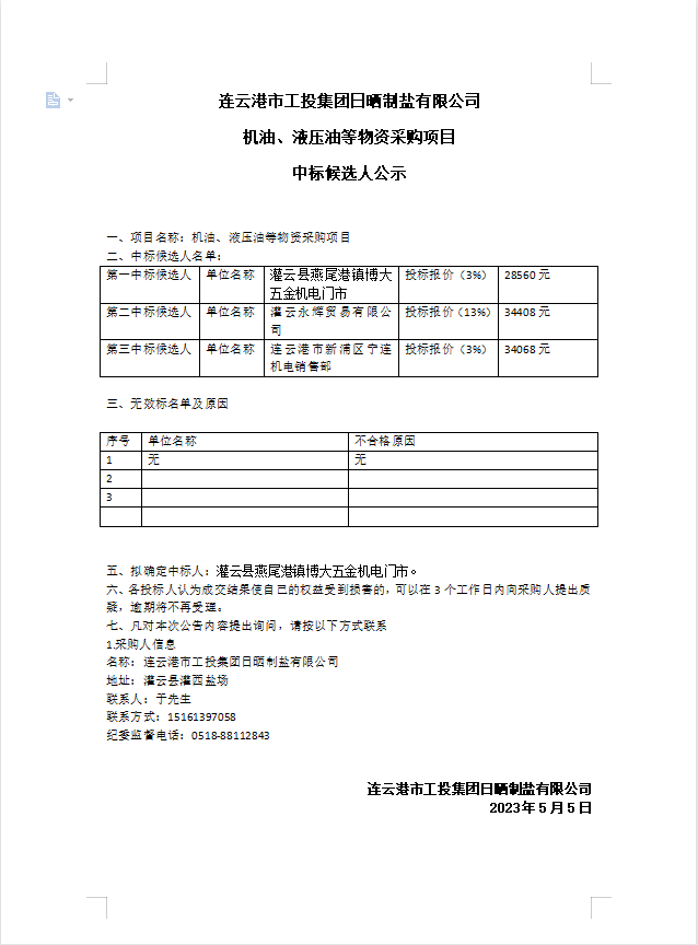 連云港市工投集團(tuán)日曬制鹽有限公司機(jī)油、液壓油等物資采購(gòu)項(xiàng)目中標(biāo)候選人公示