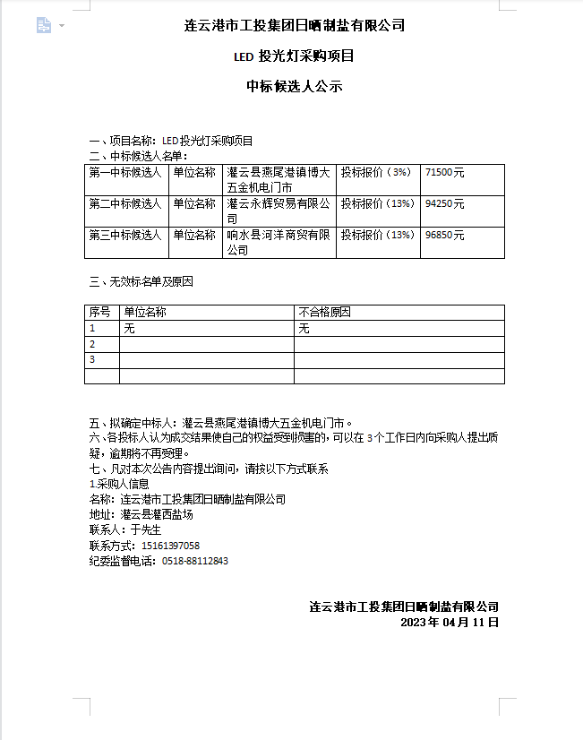 連云港市工投集團日曬制鹽有限公司LED投光燈采購項目中標(biāo)候選人公示