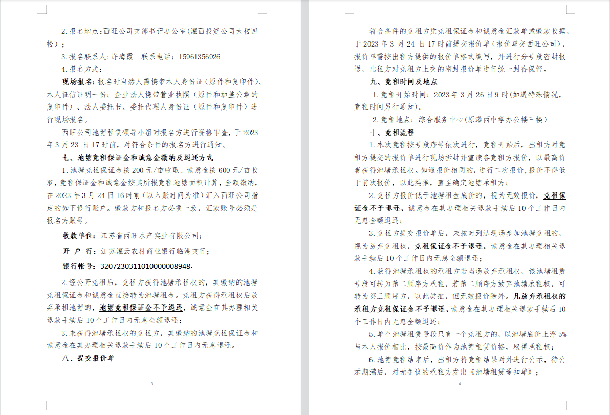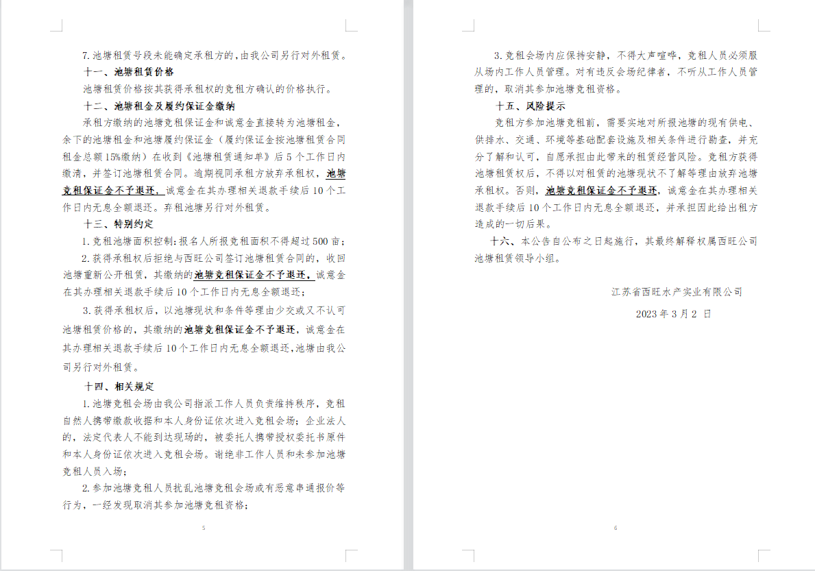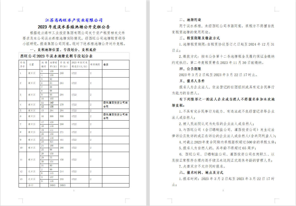 江蘇省西旺水產實業(yè)有限公司2023年度淡水養(yǎng)殖池塘公開競租公告