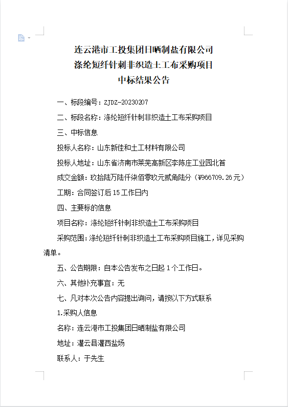 連云港市工投集團(tuán)日曬制鹽有限公司滌綸短纖針刺非織造土工布采購項(xiàng)目中標(biāo)結(jié)果公告
