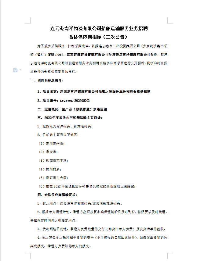 連云港宵洋物流有限公司船舶運(yùn)輸服務(wù)業(yè)務(wù)招聘合格供應(yīng)商招標(biāo)(二次公告)