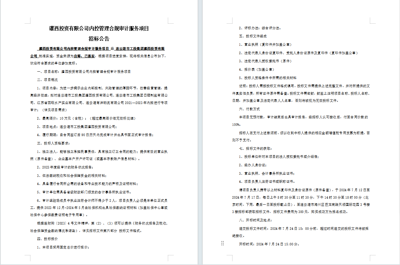 灌西投資有限公司內(nèi)控管理合規(guī)審計服務(wù)項目招標(biāo)公告