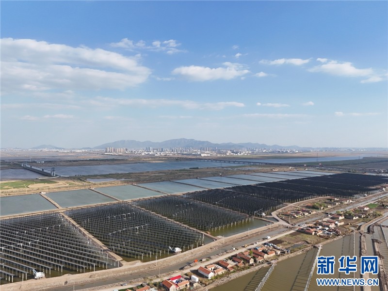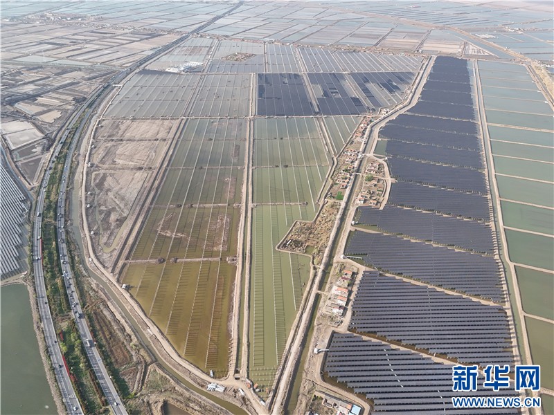 近日,在連云港經(jīng)濟技術開發(fā)區(qū)猴嘴街道三峽青口鹽場,近78萬塊光伏板如波浪般起伏,深藍色板面倒映著魚塘的波光,蔚為壯觀。