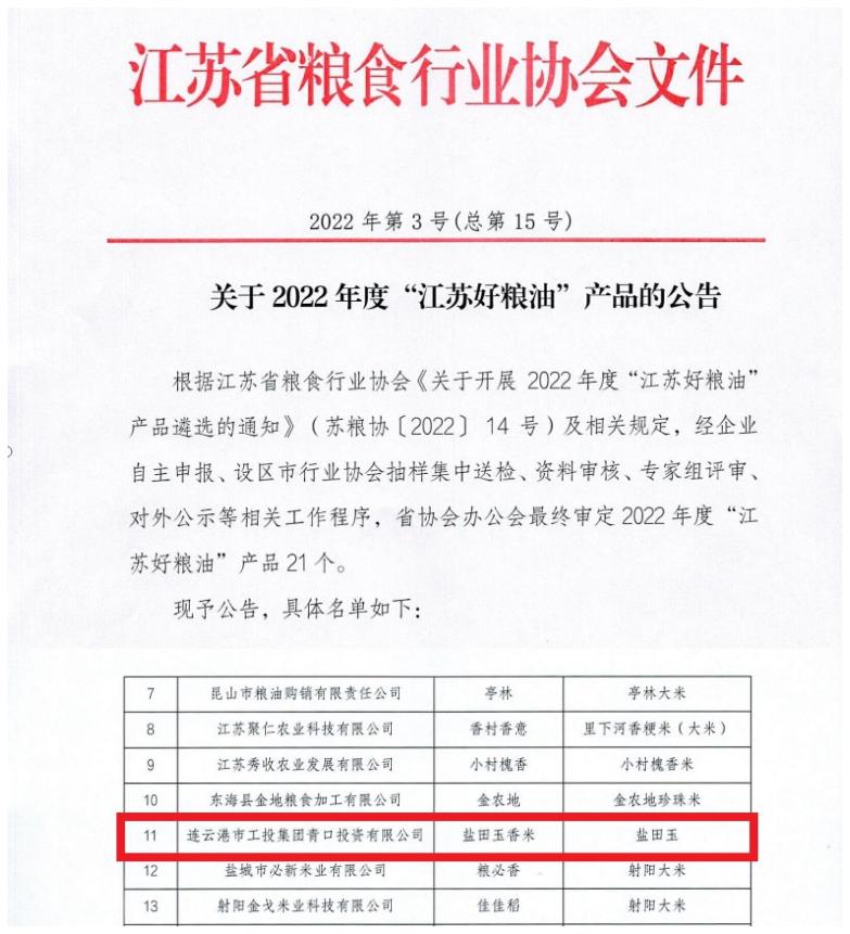 日前,江蘇省糧食行業(yè)協(xié)會(huì)發(fā)布2022年度“江蘇好糧油”產(chǎn)品名單,由我公司生產(chǎn)的鹽田玉香米成功入選。