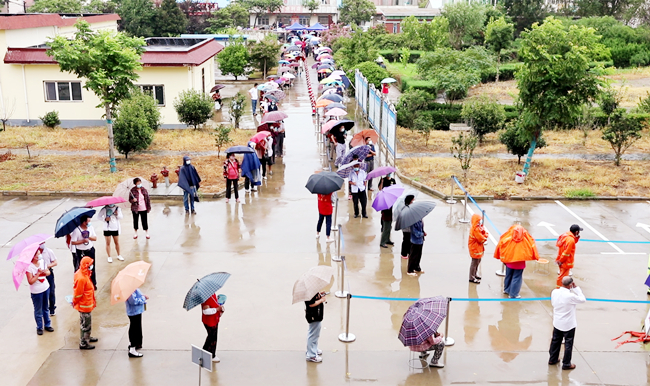 “黨旗飄在一線、堡壘筑在一線、黨員沖在一線”。核酸檢測現(xiàn)場,來自青口公司黨員志愿者在現(xiàn)場為職工群眾提供相關(guān)咨詢和掃碼指導(dǎo)服務(wù),很多黨員在核檢工作中全身濕透仍在雨中盡力維護(hù)秩序,盡管天氣不作美,但是職工群眾依然按工作人員的指導(dǎo)有序地進(jìn)行核酸檢測。大雨里,黨員紅、醫(yī)護(hù)白顯得格外耀眼。(仲偉彬)