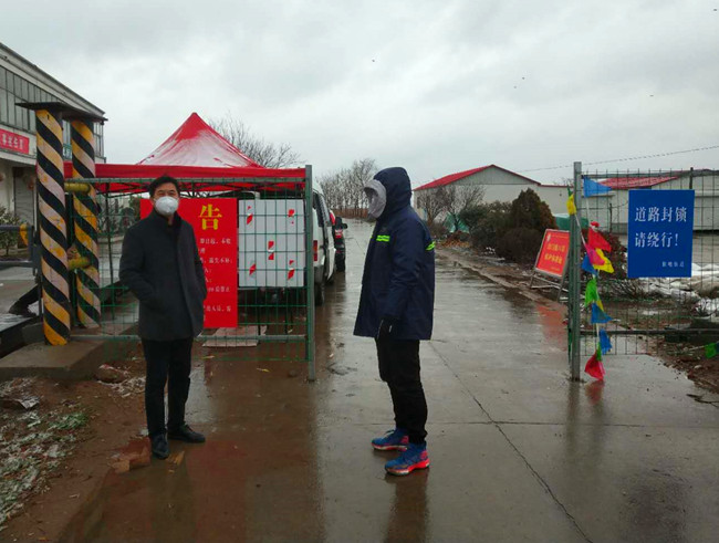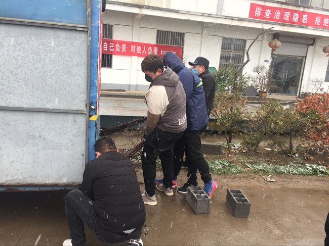 公司黨委書記、董事長胡傳法冒雪檢查成業(yè)飼料卡口,胡書記囑咐在現(xiàn)場值班的團青干部防控一線,要動真格不能含糊,堅決不給外來車輛通過。負責這里還有生產(chǎn)生活服務中心和黃沙分場的全體管理干部,大家都很辛苦,但沒有埋怨,都在默默地堅守崗位,履行職責。“你不站崗我不站崗,誰保衛(wèi)咱大場”他們是這樣說也是這樣做的。為了讓值守人員有一個溫暖的臨時休憩的場所,泰祥公司將一個臨時集裝箱拉到卡口,后勤班的小伙子們,搬運調試固定,絲毫沒有因為寒冷的天氣影響工作進度。