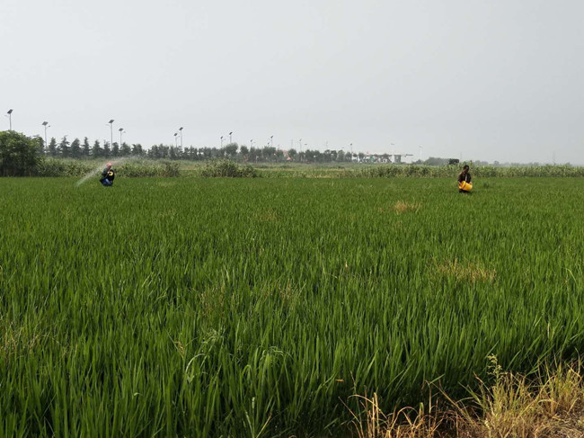 時(shí)值立秋、暴雨初晴,正是水稻孕穗旺季,大新農(nóng)場(chǎng)條田工抓住短暫晴天迅速施撒穗肥。由于近期光照少,陰雨較多,為穩(wěn)定糧食產(chǎn)量,爭(zhēng)創(chuàng)畝產(chǎn)新高,大新農(nóng)場(chǎng)結(jié)合農(nóng)技員意見(jiàn),選用復(fù)合肥+尿素作為拔節(jié)孕穗期最后穗肥施撒。(楊杰)