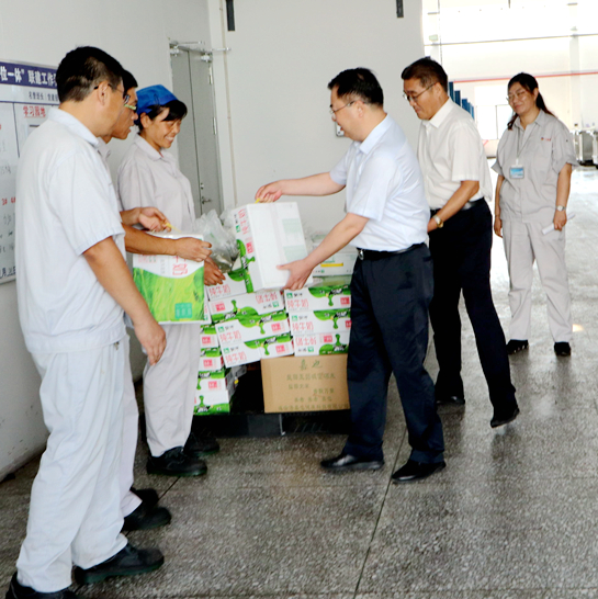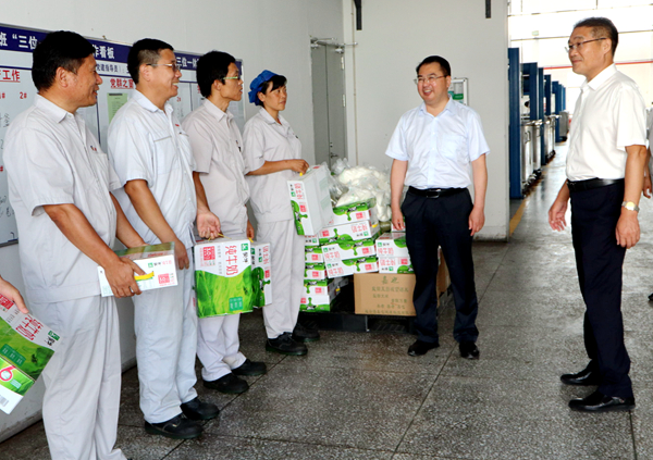 81日上午,集團(tuán)公司黨委副書記戴鴻鳴、工會(huì)主席劉承志來(lái)我公司慰問(wèn)生產(chǎn)一線員工,為辛勤工作的員工送來(lái)牛奶、綠豆等防暑降溫慰問(wèn)品。公司黨支部書記、副董事長(zhǎng)鄒德兵,總經(jīng)理韓立新等多位領(lǐng)導(dǎo)陪同。